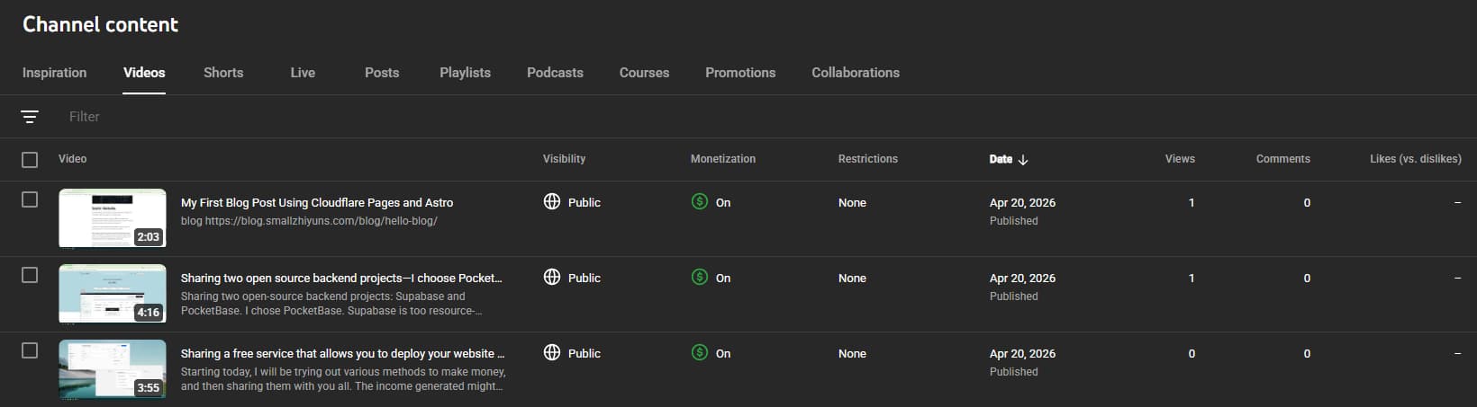 As of today, I have published several YouTube videos; however, they haven’t received any recommendations or traffic yet—essentially sitting at zero views, save for the times I watch them myself.